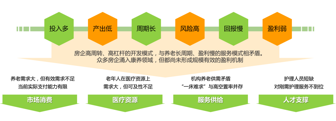 養老具有“投入多、產出低,周期長、風險高、回報慢,盈利弱”等特點,養老行業用地難、融資難、盈利難等痛點依然存在,尤其是在“醫養融合、醫保異地結算、長護險互認、以及養老結構性方面等”問題尤為突出,養老產業痛點與矛盾突出,行業仍需進一步變革。