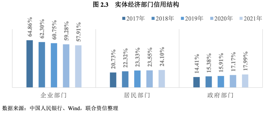 2021年信用結構變動趨勢較往年一致,企業部門信用量占比進一步走低。截至2021年末,我國企業部門、居民部門及政府部門信用量占比分別為57.91%、24.10%和17.99%,其中企業部門較2020年末下降1.37個百分點,居民部門和政府部門分別增加0.55個百分點和0.82個百分點。近年來,隨著資管新規對企業非標融資的持續壓降,居民房屋貸款及消費貸款提升,以及政府債券在政府債務顯性化過程中的持續發力,我國企業部門信用量占比連年下降,政府部門及居民部門信用量占比持續提升,2021年我國實體部門信用結構仍延此趨勢變動。