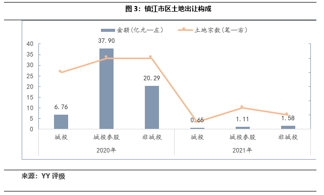 丹陽市20年經營性土地出讓29宗,收入為35.24億元,其中城投規模11宗5.76億元,;21年出讓14宗,收入為25.57億元,其中城投規模9宗17.74億元,占絕大多數;城投購買主體以丹陽高新投、丹陽投資以及丹陽經開為主。