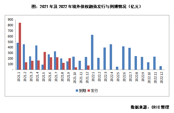 在境外融資環境緊張的同時,房企依然面臨著較大的海外還債壓力。據不完全統計,100家典型房企2022年的境外債權融資到期主要集中在上半年,其中1月份的到期規模高達627億,為近兩年中的最高;此外3月、4月、6月、7月均為境外債權融資的償債小高峰。