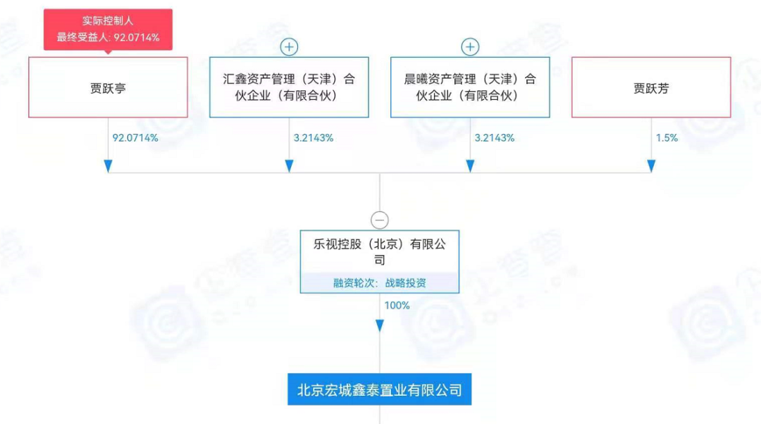 企查查資料顯示,北京宏城鑫泰是樂視控股(北京)有限公司的全資子公司,其背后的實際控制人是賈躍亭。