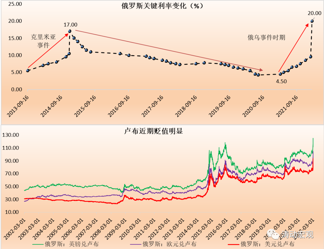 一、2022年2月28日,俄羅斯央行驚人地將其關(guān)鍵利率由9.50%大幅提升1050BP至20%,這已經(jīng)是自2021年3月以來俄羅斯央行第9次上調(diào)關(guān)鍵利率(累計(jì)上調(diào)幅度達(dá)到1575BP),同時(shí)也是上調(diào)幅度最大的一次(2014年12月曾大幅上調(diào)650BP)。從歷史上看,俄羅斯關(guān)鍵利率的上調(diào)周期有兩個(gè),第一為2013年9月至2014年12月期間(即克里米亞事件時(shí)期),第二為2021年3月至目前(即俄烏事件時(shí)期)。我們看這兩輪利率上調(diào)周期持續(xù)時(shí)間均比較長(zhǎng),前者約1年3個(gè)月,后者目前已持續(xù)1年左右。