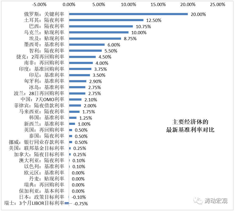 三、這里需要進(jìn)一步討論,利率的本質(zhì)是什么?我們的結(jié)論是利率某種程度上代表著風(fēng)險(xiǎn)溢價(jià)下的資本邊際回報(bào)率,當(dāng)利率比較高時(shí),意味著該經(jīng)濟(jì)體要么缺資本,要么屬于高風(fēng)險(xiǎn)的動(dòng)蕩地區(qū),即資本的要價(jià)比較高。因此通常情況下可以這么認(rèn)為,越不發(fā)達(dá)、社會(huì)越動(dòng)蕩的經(jīng)濟(jì)體,其資本越稀缺或風(fēng)險(xiǎn)較高,政策利率水平往往越高,因?yàn)橹挥薪o出足夠高的回報(bào)率才能吸引資本進(jìn)來;越發(fā)達(dá)、社會(huì)越平靜的經(jīng)濟(jì)體,其往往呈現(xiàn)出資本過剩的特征,因?yàn)橘Y本的回報(bào)率開始趨于下降,或者說性價(jià)比在下降。實(shí)際上,從目前主要經(jīng)濟(jì)體的政策利率來看,上述結(jié)論大致是能夠得到支撐的,如俄羅斯、巴西、土耳其、烏克蘭、埃及、墨西哥等經(jīng)濟(jì)體均呈現(xiàn)類似特征。