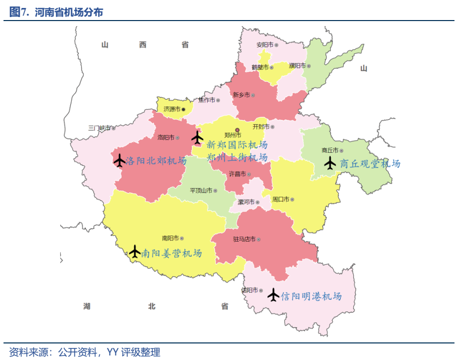 除了密集交錯(cuò)的鐵路、公路線外,地處內(nèi)陸的河南為了走出去,2013年建立了鄭州航空港經(jīng)濟(jì)綜合實(shí)驗(yàn)區(qū),開始了問天要路的發(fā)展之旅。航空港區(qū)內(nèi)的新鄭機(jī)場(chǎng)作為中國(guó)八大區(qū)域性樞紐機(jī)場(chǎng)之一,借助于港區(qū)強(qiáng)大的手機(jī)終端生產(chǎn)能力,在貨郵吞吐量中排名全國(guó)第七;同時(shí)2.5小時(shí)的航空圈可覆蓋全國(guó)人口的90%,旅客吞吐量排名全國(guó)十二,航空樞紐地位顯著。另外除了新鄭,省內(nèi)還有其他5個(gè)機(jī)場(chǎng)分別位于洛陽(yáng)、南陽(yáng)、商丘、信陽(yáng),完善補(bǔ)充了全省的航空體系。