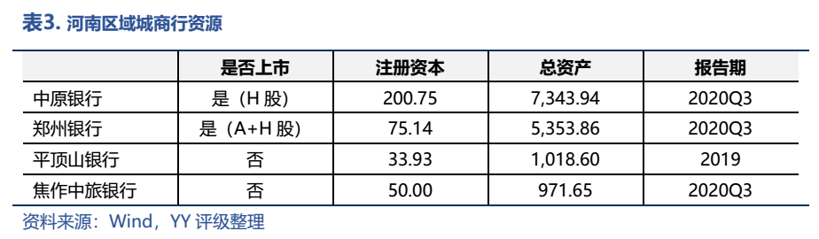 從金融實(shí)力上來(lái)看,河南的金融業(yè)不算發(fā)達(dá),對(duì)河南信用債市場(chǎng)的托底作用并不明顯。截至2020年末,各項(xiàng)存款余額為76,446.19億元。區(qū)域銀行資源上,除了在調(diào)研過(guò)程中,發(fā)行人領(lǐng)導(dǎo)們均提到的鄭東新區(qū)已集齊12家股份制銀行之外,河南還擁有中原銀行、鄭州銀行、平頂山銀行和焦作中旅銀行四家城商行,其中中原銀行和鄭州銀行兩家上市銀行的資產(chǎn)規(guī)模過(guò)五千億;農(nóng)商行規(guī)模基本上在500億以下。
