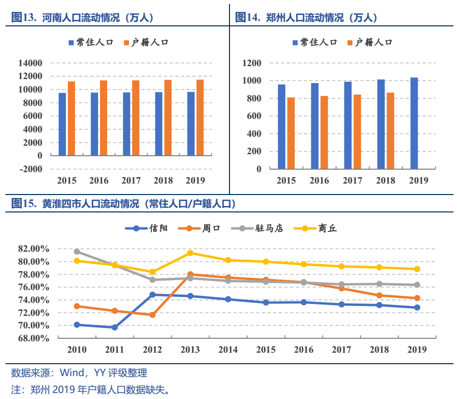 河南的人口體量很大(全國(guó)第三),整體處于凈流出的狀態(tài),2019年常住人口比戶籍人口少1,845.78萬(wàn)人;除了省會(huì)鄭州保持相對(duì)較大規(guī)模的人口凈流入之外,其余大多數(shù)地級(jí)市均處于人口外流的狀態(tài),且常住人口增長(zhǎng)緩慢,特別是渝東南塌陷區(qū)的周口、信陽(yáng)、商丘、駐馬店,這黃淮四市的常住人口占全省常住人口的31%,是省內(nèi)重要的糧食生產(chǎn)區(qū),但常住人口與戶籍人口的比例均低于80%,且凈流出的趨勢(shì)較前幾年更甚,是流出人口的主要來(lái)源地。