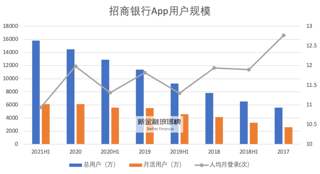 具體來看,招商銀行App月活用戶6141萬戶,較去年末僅僅增加15萬戶,人均月登錄次數從去年的11.98次降至10.94次。好在,日活用戶峰值從去年的1629萬戶上升到1747萬戶。