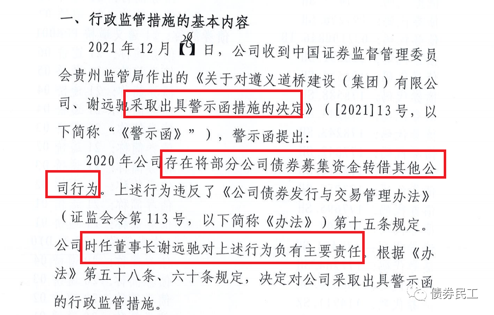 1、根據(jù)遵義道橋建設(shè)(集團(tuán))有限公司(以下簡稱“遵義道橋”)于2022年1月4日披露的公司公告(公告蓋章日期為2021年12月31日),因?yàn)樵?020年存在將部分公司債券募集資金轉(zhuǎn)借其他公司的行為,被貴州證監(jiān)局采取出具警示函措施。公告中未披露遵義道橋轉(zhuǎn)借債券募集資金涉及的具體債券名稱情況。