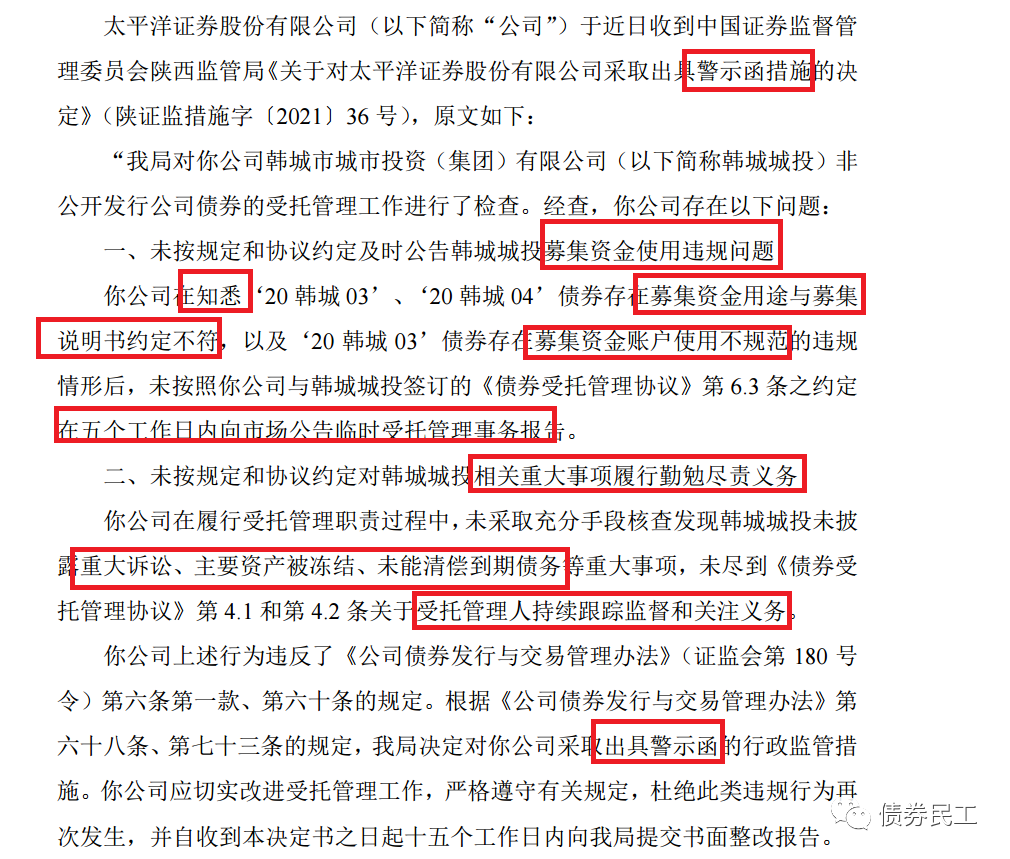 3、太平洋證券股份有限公司于2021年12月1日公告,陜西證監(jiān)局對公司出具警示函,主要原因是未能及時披露韓城市城市投資(集團(tuán))有限公司(募集資金使用違規(guī)問題和未履行重大事項(xiàng)勤勉盡責(zé)義務(wù)。
