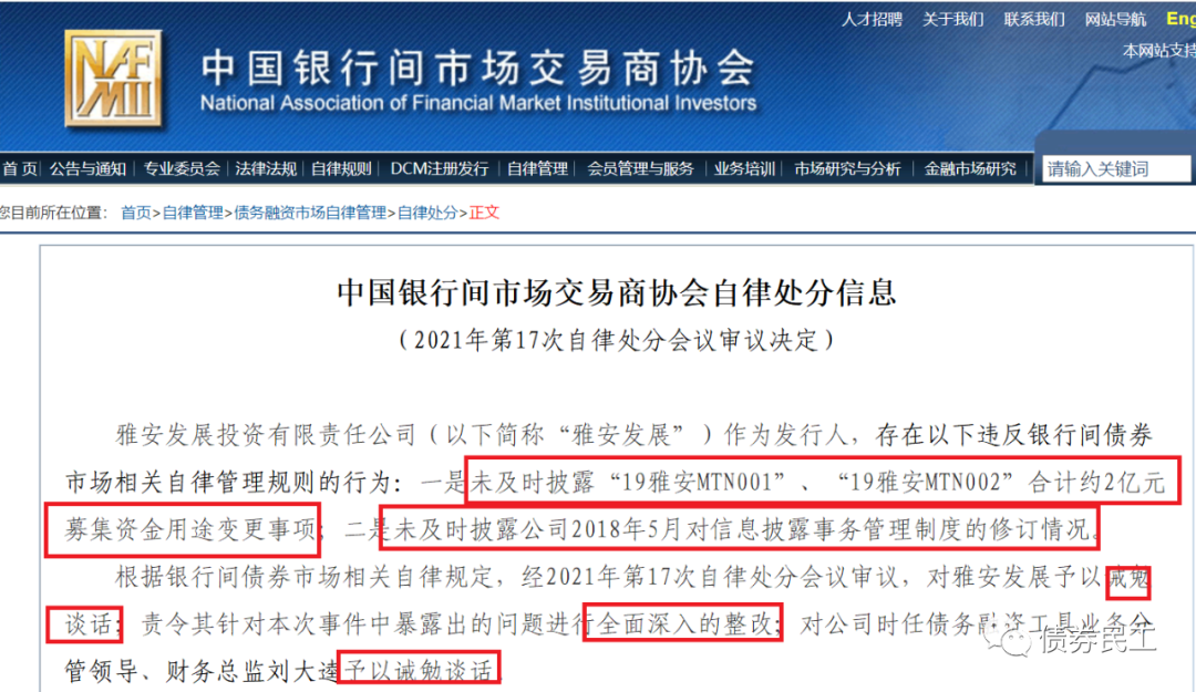 5、根據(jù)中國銀行間市市場交易商協(xié)會2021年10月29日披露的信息,雅安發(fā)展投資有限責(zé)任公司因未及時披露“19雅安MTN001”、19雅安MTN002”募集資金用途變更、未及時披露對信息披露事務(wù)管理制度的修訂,被交易商協(xié)會自律處分。處分措施包括對公司的誡勉談話、全面深入的整改以及對高管的誡勉談話。
