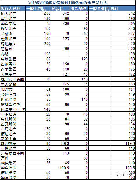 下面統計了2015年和2016年債券發行金額超過100億元的發行人,不乏恒大、華夏幸福、天房、泰禾等網紅高收益主體。從地產三大信用債的選擇方面,明顯是交易所品種>協會品種>企業債。