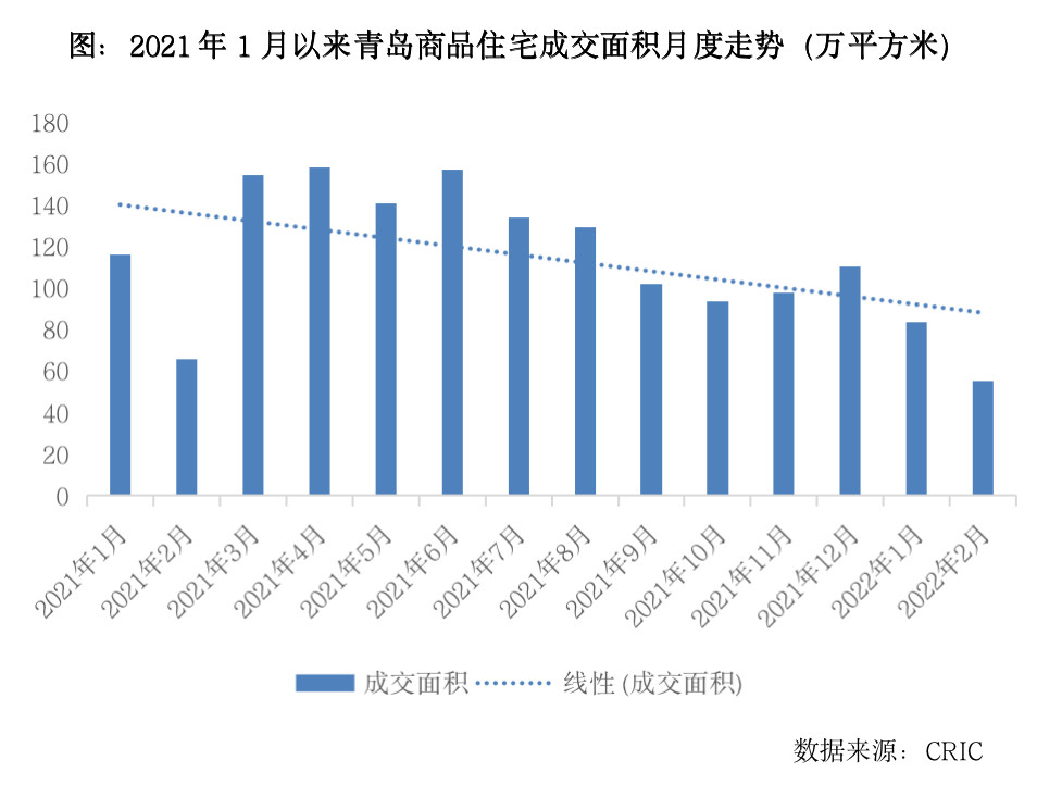 除了由于供地質(zhì)量不佳外,我們認為青島此次土拍平平的另一大原因在于近期樓市表現(xiàn)較為萎靡。結合新建商品住宅成交規(guī)模走勢來看,2021年下半年以來青島的樓市成交明顯遇冷,樓市成交規(guī)模下滑趨勢較為明顯,其中2022年1-2月累計成交規(guī)模同比降幅達23%。