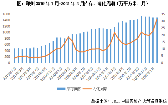 CRIC數(shù)據(jù)顯示,鄭州新房狹義庫(kù)存規(guī)模就已接近1500萬(wàn)平方米,消化周期超過(guò)20個(gè)月,2021年2月,由于成交持續(xù)低位徘徊,新房庫(kù)存消化周期更是躍升至31個(gè)月。
