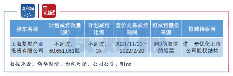 截至11月1日,復(fù)星產(chǎn)投持有公司無(wú)限售條件流通股6.72億股,占公司總股本比例33.24%,是公司第一大股東,與公司控股股東上海復(fù)星高科技(集團(tuán))為一致行動(dòng)人。若此次減持計(jì)劃順利實(shí)施,將是復(fù)星產(chǎn)投自公司2014年上市以來(lái)的第一次減持,按照11月1日公司收盤(pán)價(jià)14.61元/股來(lái)估算,此次減持復(fù)星產(chǎn)投或套現(xiàn)近8.9億元。