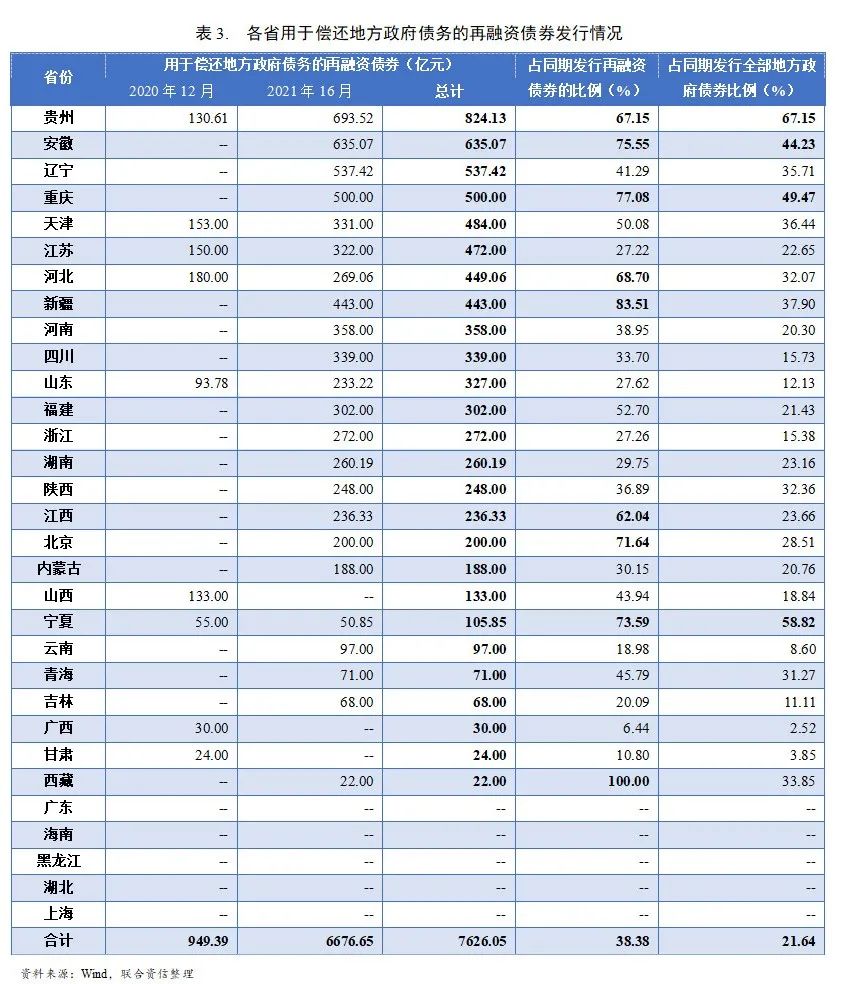截至2021年6月末,貴州發(fā)行用于償還地方政府債務(wù)再融資債券的規(guī)模最大,高達824.13億元,占該省同期(2020年12月及2021年上半年)發(fā)行再融資債券的比例為67.15%,占該省期間發(fā)行全部地方政府債券的67.15%。安徽、遼寧、重慶、天津、江蘇、河北、新疆等省份發(fā)行規(guī)模亦不小,均在400億元以上。