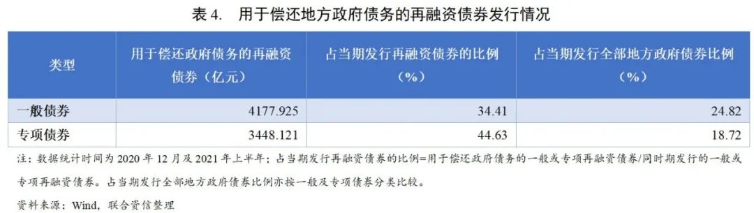 2020年12月及2021年上半年,用于償還政府債務(wù)的一般債券和專項債券分別為4177.93億元和3448.12億元,分別占同期發(fā)行再融資債券的比例為34.41%和44.63%,分別占同期發(fā)行全部地方政府債券的比例為24.82%和18.72%。化債用途專項債券在再融資債券中的占比相對較高,或由于地方政府隱性債務(wù)的認定通常需要保證債務(wù)與公益性項目資產(chǎn)相對應(yīng),因此用于項目投資的專項債券或更適合對非債券形式的債務(wù)進行置換。