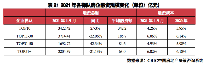 企業(yè)表現(xiàn):本月融資總量最高的企業(yè)為招商蛇口,融資總量約85.70億元,主要是為發(fā)行了合計(jì)30億元的超短融和為多家子公司進(jìn)行了擔(dān)保;此外碧桂園發(fā)行了一筆78.30億港元的換股債券,融資量較高。從企業(yè)梯隊(duì)來看,2021年1-9月平均額最大為TOP10房企,平均融資額342.2億元,同時(shí)實(shí)現(xiàn)融資總額同比上升,是唯一一個同比上升的梯隊(duì);TOP31-50梯隊(duì)融資總額同比降幅最大,降幅達(dá)到42.34%。成本來看,4個梯隊(duì)均較2020年全年下降,其中TOP10梯隊(duì)的融資成本最低,為4.26%,下降幅度為1.69pct,降幅最大。