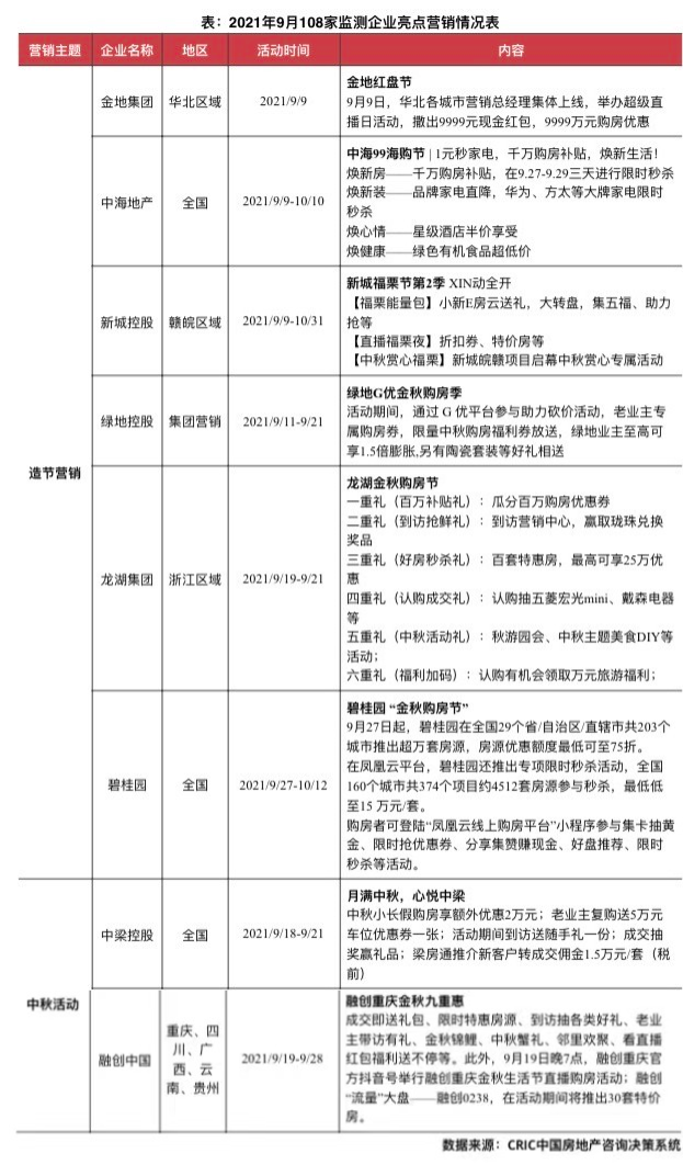 9月營銷方式仍然以造節(jié)為主,折扣力度出現(xiàn)松動,主要體現(xiàn)在特價(jià)房、工抵房上。從營銷方式來看,本月房企營銷仍然以造節(jié)營銷為主,龍湖、碧桂園以節(jié)日為名推出“金秋購房節(jié)”,中海以日期為名,推出“99海購節(jié)”,新城則以企業(yè)支持的公益活動為名推出“新城福栗節(jié)”。優(yōu)惠讓利上也比較一致,主要是優(yōu)惠券和特價(jià)房兩種方式。不過需要關(guān)注的是,本月桂林和青島出現(xiàn)了扣力度較大的“工抵房”特價(jià)房源,惠州也出現(xiàn)了零首付、購房返現(xiàn)等現(xiàn)象,壓力之下企業(yè)折扣出現(xiàn)松動。
