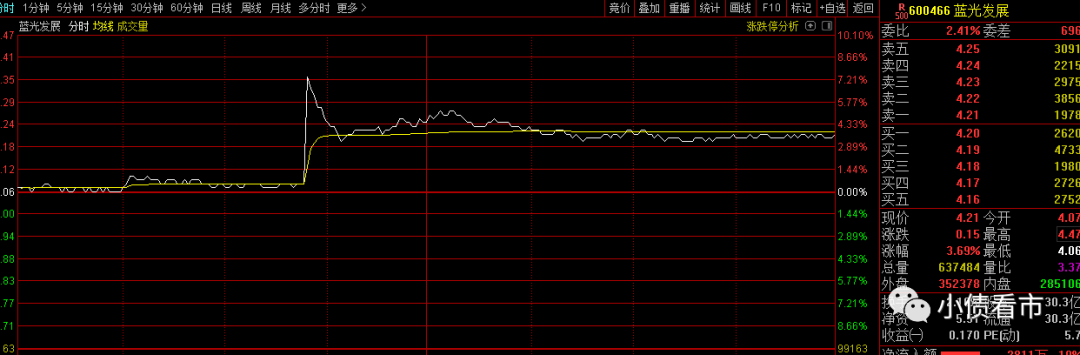受此消息影響,4月22日早盤藍(lán)光發(fā)展盤中直線拉升并觸及漲停,隨后股價(jià)震蕩回落,成交量明顯放大,收盤報(bào)4.21元,漲幅為3.69%。