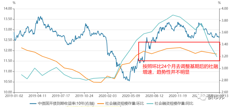 比如PPI同比增速高,央媽認為主要是因為去年同期低基數的影響,大家也都認可這個解釋;但社融拐點確認,看多的朋友卻完全不考慮去年高基數效應,直接用21年和20年進行同比分析,總有一種雙標的感覺,哪種口徑對結論有利我就用哪個……如果將2021年的社融存量和2019年的同期進行對比,排除掉疫情期間高基數影響后,可以看到趨勢性并不是太明顯。