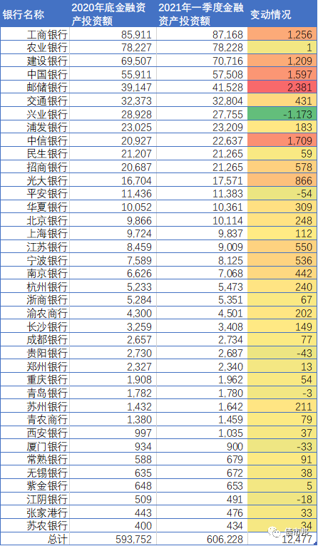 首先來看看商業銀行這個債券市場最大的買方,商業銀行自營的投債資金主要來源于兩個方面,一個是增量資金。每年商業銀行的資負部門會在年初結合各方面因素,確定增量資金在債券、公司貸款、個人貸款和票據之間的擺布,從A股38家上市銀行公布的數據來看,其金融投資投資科目(主要是債券投資)之和,從年初的59.37萬億元,上升到3月底的60.62萬億元,仍然保持了一個穩定的增長。