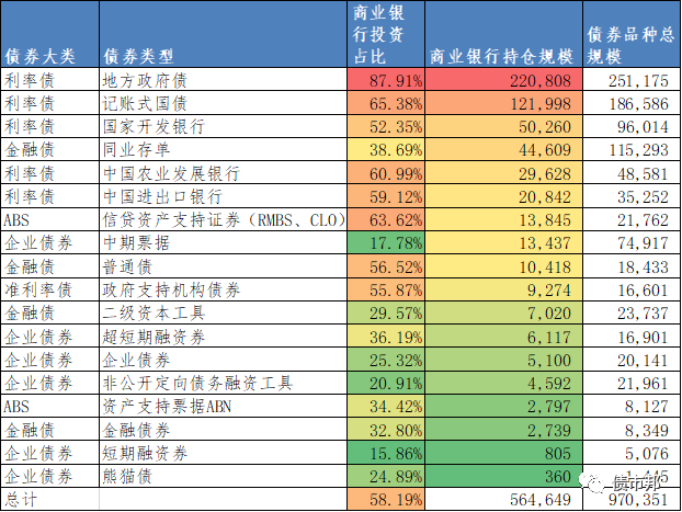 按照中債登和上清所的登記托管數據,商業銀行的銀行間市場的整體持倉情況如下表所示。因為交易所債券所采用的統計口徑,和銀行間市場的統計口徑有較大的差異,沒有商業銀行的投資機構分類,而是和財務公司、工商企業等一并列入”一般法人“,無法區分數據進行統計。但整體而言商業銀行自營的現券投資還是集中在銀行間市場品種,剔除交易所品種不會有太大影響。