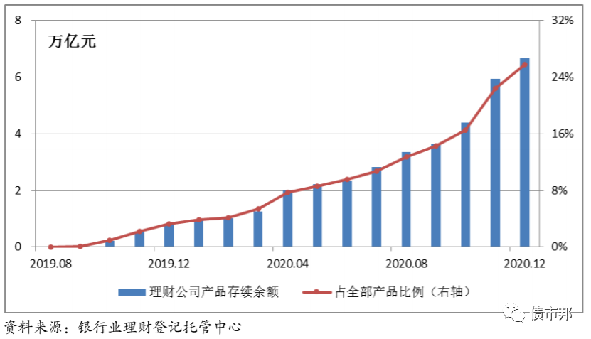 資管機構方面,近期欠配壓力最為明顯的還是集中在商業銀行理財子公司上。隨著資管新規持續深化和理財子公司業務的發展,銀行資產管理部過去發行的,可以投資于非標的老產品到期后,里面的資金往往進入到同一銀行理財子公司發行的主要配置于標類債券的新產品。從理財托管中心公布的數據看,商業銀行理財子公司發行的新產品規模從2020年初的不到1億元上漲到2021年初的6.67萬億元,且持續保持著快速增長。