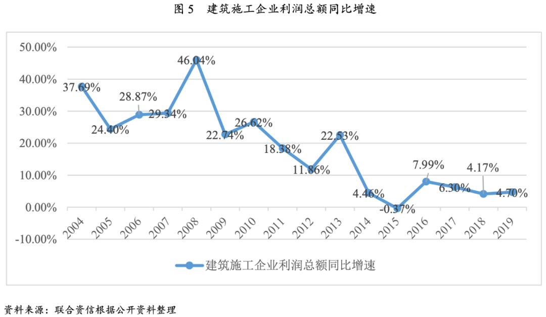 受固定資產(chǎn)投資下行壓力影響,2015年以來建筑業(yè)總產(chǎn)值增速低位波動,建筑業(yè)增加值增速整體呈現(xiàn)下滑趨勢。在行業(yè)整體收縮的狀態(tài)下,建筑施工企業(yè)競爭進一步加劇,利潤總額增速降幅明顯。