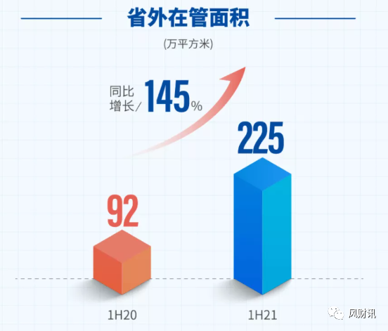 不過相對而言,省外在管面積有所提升,225萬平方米同比增長了145%;對營收的貢獻也從2%增長到了6.1%。