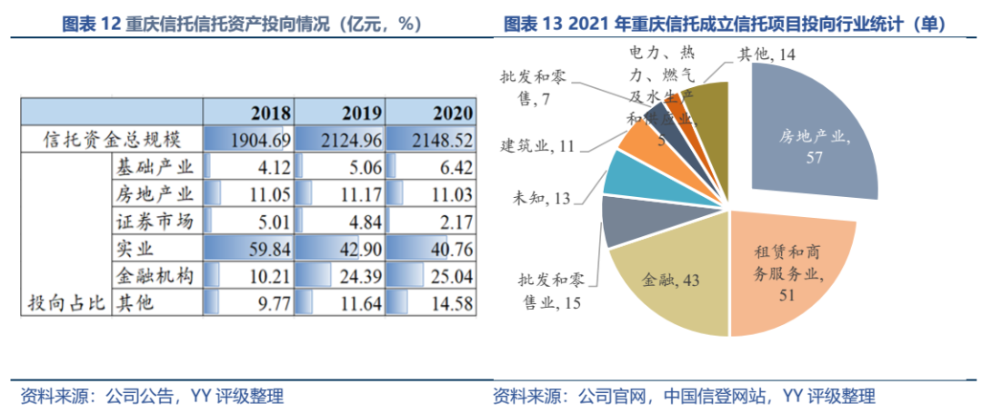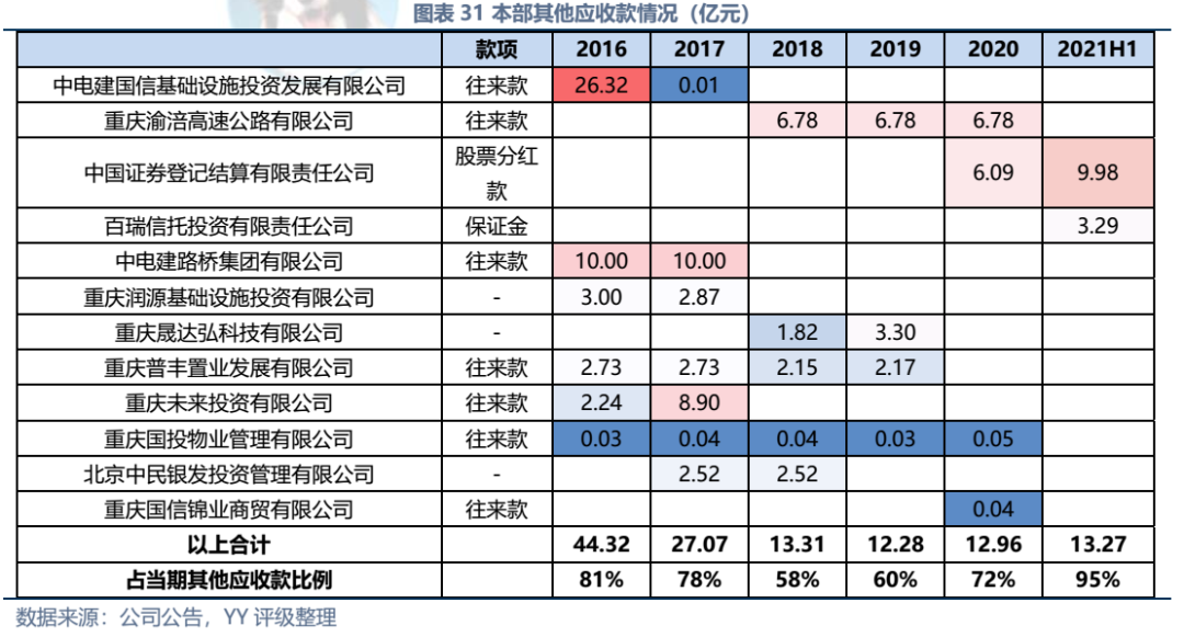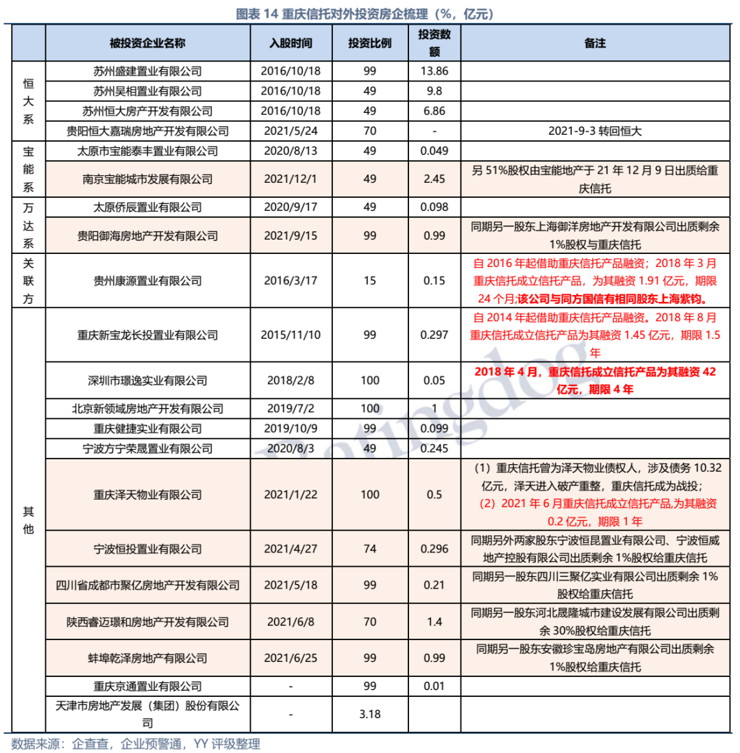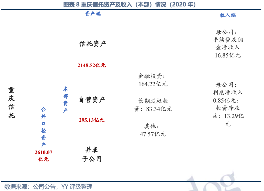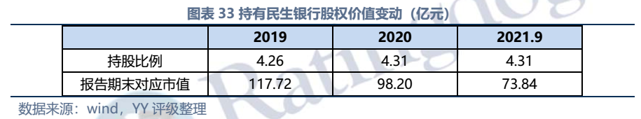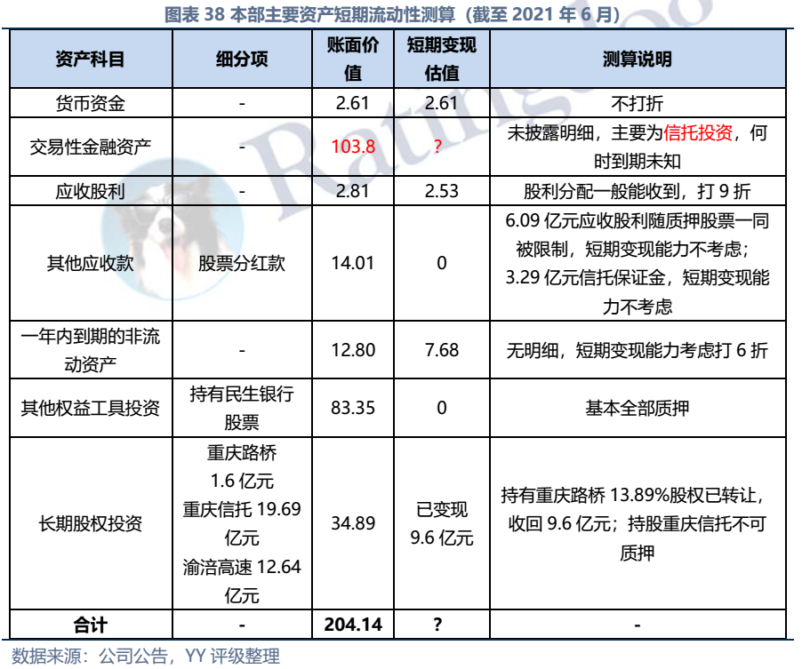 因同方國信子公司獨(dú)立性較強(qiáng),我們主要梳理了本部的資產(chǎn)以及測算了債務(wù)壓力和短償債能力。資產(chǎn)方面,以信托投資(交易性金融資產(chǎn)103億元主要為信托投資)、民生銀行股票(最新市值約73億元,已質(zhì)押,2019年來市值縮水37%)、重慶信托67%股權(quán)(賬面以成本法計(jì)量僅20億元,但按重慶信托最新凈資產(chǎn)計(jì)量則價(jià)值282億元)為主;債務(wù)方面,19年以來,本部有息債務(wù)水平有所降低(主要通過可供出售金融資產(chǎn)變現(xiàn)償還),截至21年中,有息債務(wù)205億元,短債107億元,22年將有64億元債券到期或行權(quán),短債壓力較大。測算短期可變現(xiàn)資源,預(yù)計(jì)短期內(nèi)變現(xiàn)能力比較確定的僅約22億元,要覆蓋22年內(nèi)到期或行權(quán)的64億元債券還有較大缺口,可能需要關(guān)注信托投資資產(chǎn)或者牌照的價(jià)值(比較難及,且由于重慶信托股權(quán)不可質(zhì)押,且前文所描述,重慶信托的真實(shí)控制權(quán)在新渝富的持股鏈條上,同方國信更多是居于財(cái)務(wù)投資這一角色,可能如果臨時(shí)出現(xiàn)兌付危機(jī),假設(shè)重慶信托的資產(chǎn)質(zhì)量仍有支持,股權(quán)仍有較高價(jià)值)。