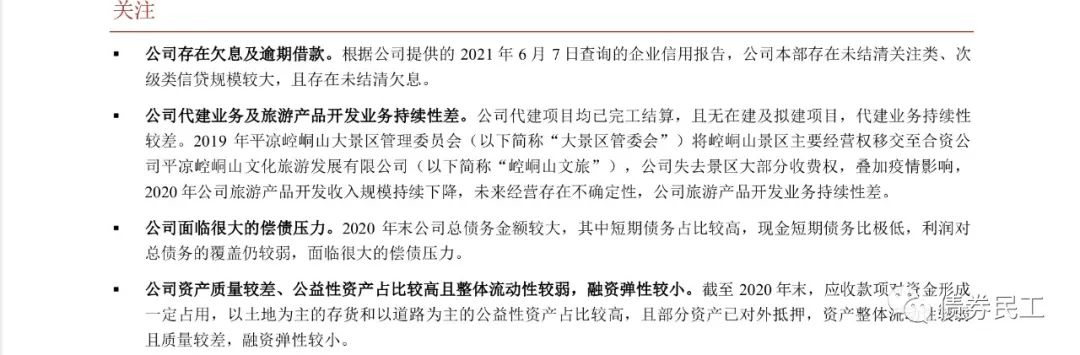 4、平?jīng)鑫幕糜萎a(chǎn)業(yè)投資集團(tuán)有限責(zé)任公司(以下簡稱“平?jīng)雎猛丁保?。根?jù)中證鵬元6月29日出具的跟蹤評級報告,平?jīng)雎猛侗静看嬖谖唇Y(jié)清關(guān)注類、次級類信貸規(guī)模較大,且存在未結(jié)清欠息。平?jīng)雎猛兜目毓晒蓶|為平?jīng)鍪袊Y委,最新主體評級為A+,評級展望為穩(wěn)定,目前存續(xù)債券1只,分別為“15平崆旅債”(企業(yè)債券,債券余額為1.4億元),由瀚華融資擔(dān)保股份有限公司提供擔(dān)保。