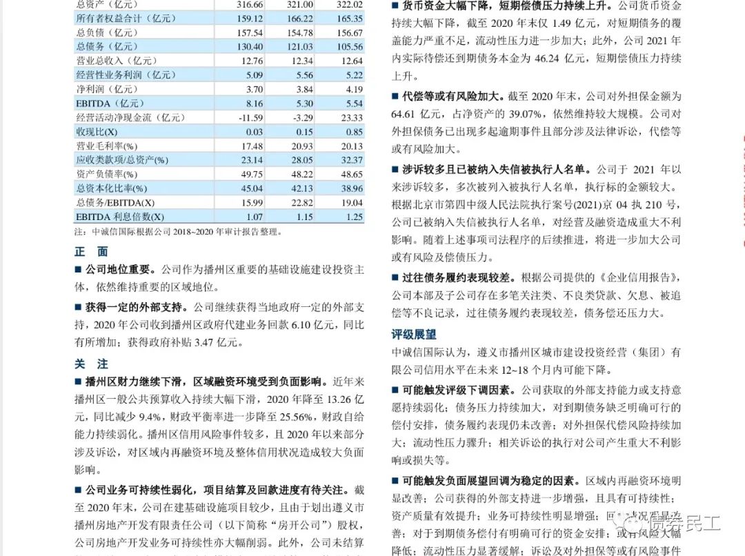 3、遵義市播州區(qū)城市建設(shè)投資經(jīng)營(集團(tuán))有限公司(以下簡稱“播州建投”)。根據(jù)中誠信國際2021年6月29日出具的跟蹤評級報告,播州建投存在多筆關(guān)注類、不良貸款、欠息、被追償?shù)炔涣加涗?,且已?jīng)被納入失信被執(zhí)行人名單。播州建投的控股股東為遵義道橋建設(shè)(集團(tuán))有限公司,播州建投最新主體評級為AA-,評級展望為負(fù)面,目前存續(xù)債券2只,分別為“17遵義播投債01”(企業(yè)債券,債券余額為6.4億元)、“PR播投02”(企業(yè)債券,債券余額為5.6億元)。