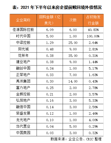 在此背景下,境外債券市場重現(xiàn)回購潮,據(jù)不完全統(tǒng)計(jì),2021年下半年以來,18家房企陸續(xù)實(shí)行境外債回購舉動(dòng),回購次數(shù)超過100次,從贖回?cái)?shù)額來看,房企累計(jì)回購境外債券及票據(jù)涉及資金合計(jì)15.6億美元,占初始發(fā)行金額4.07%。