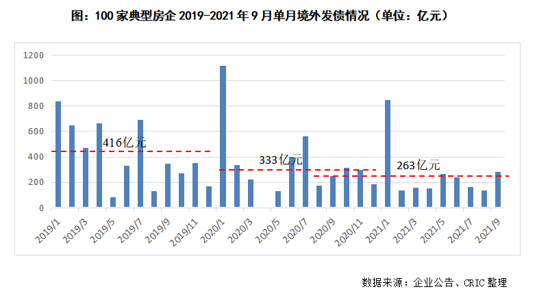 而2021年以來,房企債務(wù)違約事件增加,且逐步蔓延至頭部房企,同時(shí)違約產(chǎn)品從此前的信托貸款等非標(biāo)產(chǎn)品,蔓延到境內(nèi)公募債違約,從而引發(fā)公募債券的信用風(fēng)險(xiǎn);而疊加房貸兩集中等政策的影響,境外投資者對未來房地產(chǎn)行業(yè)的發(fā)展有所擔(dān)憂,是以近期房企境外發(fā)債市場波動(dòng)較大,房企境外新債發(fā)行受阻。2021年前九月房企境外發(fā)債融資額僅占2021年全年到期金額的75%,72%的房企新發(fā)行債券小于2021年到期債券總額,而2020年前九月境外發(fā)債是2020年全年到期金額的2.42倍,彼時(shí)僅有43%的企業(yè)發(fā)行新債低于到期債券。