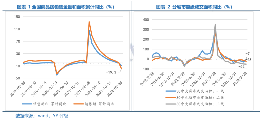 22年1-2月全國房地產(chǎn)開發(fā)投資累計(jì)同比上升3.7%,較21年1-12月下降0.7pct,當(dāng)月同比上升3.67%,較21年12月增加17.58pct。我們認(rèn)為在土地購置費(fèi)占比減少的當(dāng)前開發(fā)構(gòu)成中,可能更多依賴原材料上漲拉升施工增長。結(jié)合新開工、施工和竣工面積累計(jì)同比仍在下滑,分別較21年1-12月下降0.8pct、3.4pct和21.0pct,故成本端的上漲而非真實(shí)投資面積的增長使得開發(fā)投資繼續(xù)超預(yù)期的可持續(xù)性較弱。