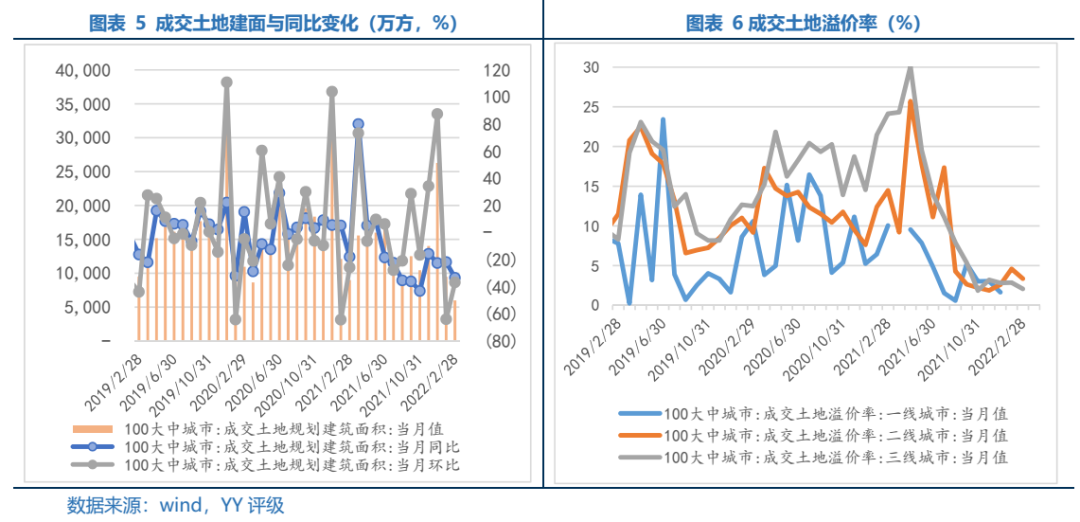 根據(jù)銷售-拿地-開工投資的經(jīng)營流程鏈條,在銷售大幅下滑的情況下土地市場(chǎng)同樣降溫顯著。22年2月份百城土地成交建面6846.6萬方,當(dāng)月同比和環(huán)比分別為-33.4%、-36.8%。一方面由于2月春節(jié)因素,土地供應(yīng)規(guī)模有所下滑,另一方面從成交土地溢價(jià)率看,疫情和經(jīng)濟(jì)放緩周期下土拍市場(chǎng)表現(xiàn)冷清,二三線土地溢價(jià)率繼續(xù)回落。后續(xù)隨著土地供應(yīng)在3-4月份集中出讓,土地成交建面料會(huì)有所抬升,但實(shí)質(zhì)拿地?zé)崆槎鹊幕厣€需結(jié)合銷售、市場(chǎng)預(yù)期、企業(yè)盈利等。