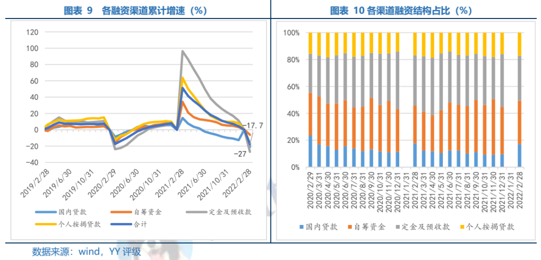 融資負(fù)債端看,資金來源規(guī)模收縮表現(xiàn)出較大的不穩(wěn)定性。22年1-2月資金來源同比下降17.7%,較21年1-12月-21.9pct。具體渠道看,貸款、自籌資金、預(yù)收款和個(gè)人按揭分別同比-21.1%、-6.2%、-27.0%和-16.9%,分別較21年1-12月-8.4pct、-9.4pct、-38.2pct和-24.9pct。其中受銷售持續(xù)大幅下滑的影響,資金來源占比最大的經(jīng)營性回款(即預(yù)收款和個(gè)人按揭)下滑幅度最大,其次為自籌和銀行貸款。資金鏈壓力仍在加劇,銀行、信托等抽貸部分民企,再融資市場(chǎng)幾乎冰封,進(jìn)一步讓更多投資者選擇撤回,負(fù)循環(huán)加速。