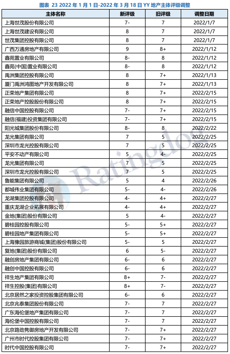 2022年1月1日至3月18日,YY評(píng)級(jí)綜合評(píng)估行業(yè)基本面、個(gè)體信用資質(zhì)及負(fù)面輿情等因素,下調(diào)42家地產(chǎn)主體評(píng)級(jí),即包括目前面臨流動(dòng)性或再融資困境的民營房企,也包括經(jīng)營能力較弱的央企/國企地產(chǎn)主體。
