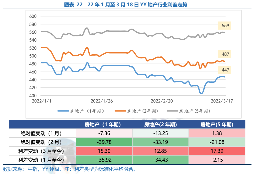 資金壓力下大小型房企普遍縮減開支,后續(xù)存量土儲(chǔ)還將持續(xù)下降,資產(chǎn)質(zhì)量發(fā)生質(zhì)變,影響未來造血能力。行業(yè)利差層面,由于當(dāng)前房地產(chǎn)政策尚難以帶來實(shí)質(zhì)恢復(fù),地產(chǎn)銷售情況仍低迷,市場(chǎng)情緒擾動(dòng)更容易造成利差波動(dòng)。