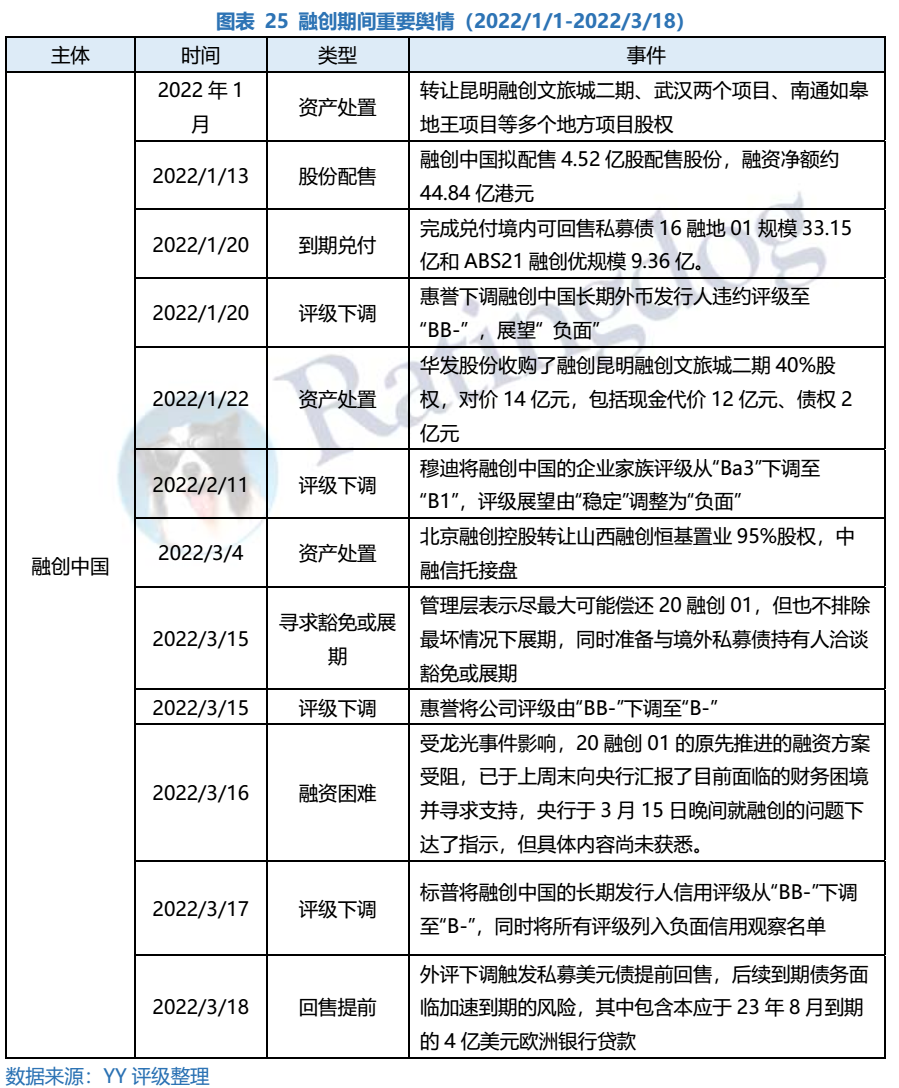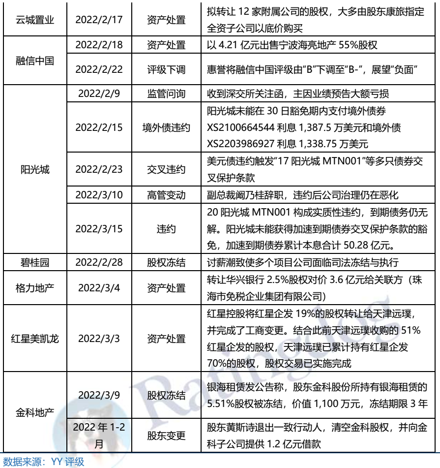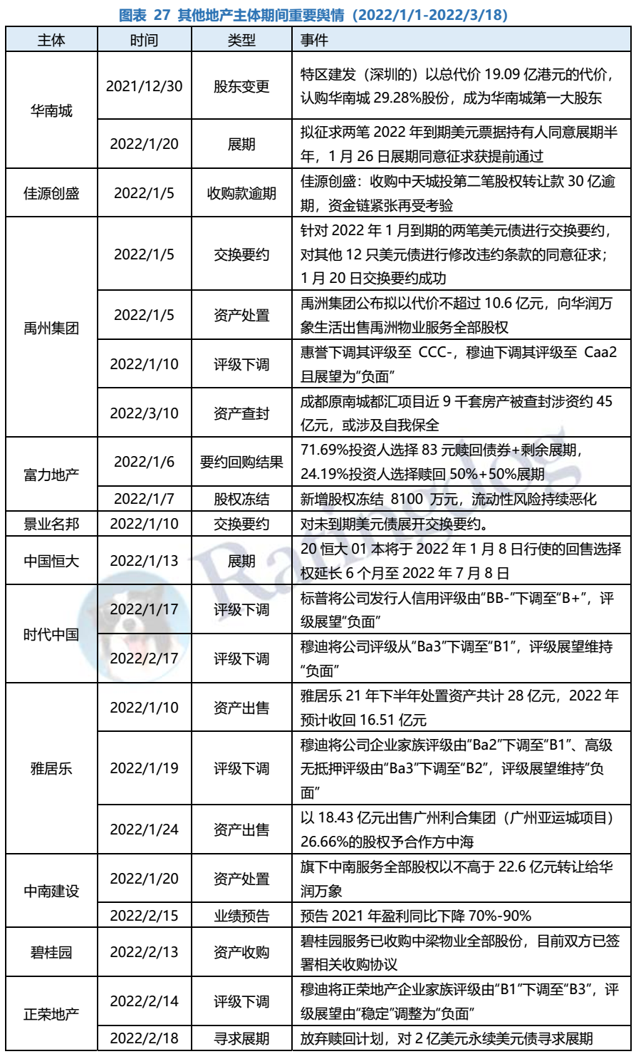 整體來看,2022年1月1日-3月18日,在行業(yè)銷售下行、外部評(píng)級(jí)下調(diào)及再融資受困等多重不利因素之下,各地產(chǎn)民企招式盡出,但仍止不住負(fù)面輿情發(fā)酵,違約/展期已由高杠桿弱資質(zhì)主體蔓延至此前市場(chǎng)認(rèn)為相對(duì)資質(zhì)尚可的主體,。