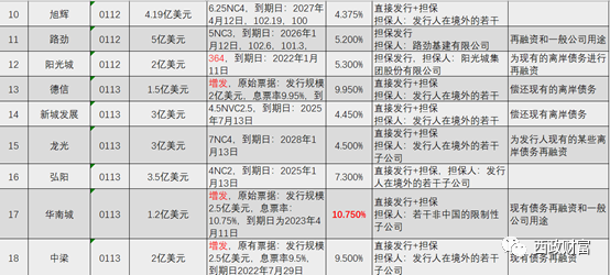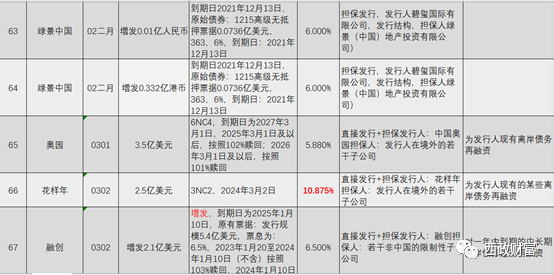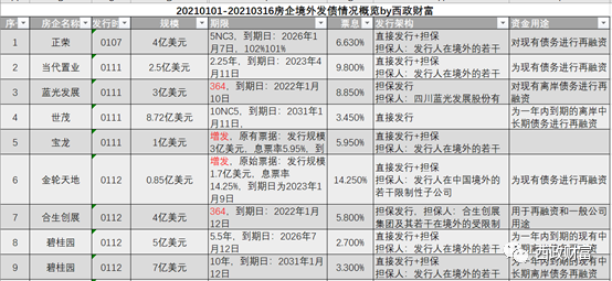 據我們不完全統計,2021年年初至今發行的70多支中資美元債中,以對現有債務再融資為目的的中長期債券相對居多;從發行票息來看,國央企(中國海外宏洋2.45%、華發3.6%、越秀3.8%)以及頭部房企及前30強房企(如碧桂園2.7%、世茂3.45%、旭輝4.375%、新城4.45%、龍光4.5%等)票息相對較低;上坤及隆基泰和由于首次發行境外美元債,此次發行的364天的美元債票息分別為12.75%及12.5%。除此之外,近期發行美元債的百強房企中,票息最高的為鑫苑置業的中長期美元債,票息為14%;另外,票息在10%以上的還有金輪天地(14.25%)、廣州方圓(13.6%)、佳源國際(12.5%)、陽光100中國(12%)、華南城(11.95%)、當代置業(11.95%)、富力(11.75%)、花樣年(11.625%)。從發行期限來看,發行期限以中長期為主。從發行架構來看,以RegS私募方式發行的債券規模仍居主導,直接發行+擔保為主要發行方式,另外,由于北大方正拒認提供維好協議的美元債券事件令維好協議風險再度聚焦,風險溢價上升,由此導致以維好架構發行的債券規模大幅下降。