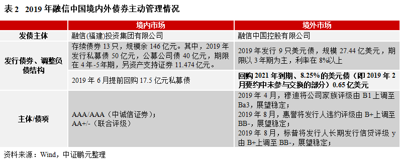 2019年2月8日公告,公司對4只2021年到期的8.25%優(yōu)先票據(jù)中未償付的部分采用“交換要約+同意征求”方式進行負債管理,同時面向合格持有人發(fā)行額外新票據(jù),來滿足延長現(xiàn)有債務期限,和對1年內(nèi)到期中長期債務進行再融資的需求。具體內(nèi)容見下表。
