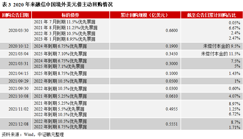 2020年來,融信中國累計多次主動回購存續(xù)美元債,調(diào)整負債結(jié)構(gòu),增強市場信心,且多在債券到期日之前進行。2021年共發(fā)行11億美元債券,回購約1.24億美元,其中2021年和2022年到期的約0.49億美元。