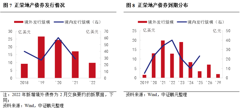 根據(jù)未審計的財務報告,截至2021年末,融信中國一年內(nèi)到期的借款約227.34億元,而非受限貨幣現(xiàn)金只有約155億元,短期償債壓力巨大。目前,融信中國力保境內(nèi)外債券不違約,2022年上半年到期美元債均如期兌付,存續(xù)美元債6只,利率在6.75%-8,95%之間,下半年境外到期債券1只,存續(xù)規(guī)模7億美元。2022年4月,融信中國出現(xiàn)在12家風險房企紓困名單中。考慮土地儲備集中在長三角地區(qū)(占比約45%),一二線城市占比約82%,土儲質(zhì)量相對較高。未來,債務風險處置,將通過資產(chǎn)變現(xiàn)、增加抵押擔保等方式獲取流動性,以及債務合理展期,降低短期償債壓力,維持運營,獲取更多時間。