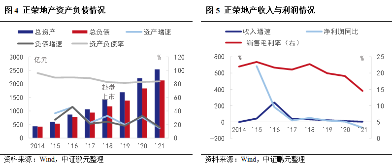 具體來看,2021年正榮地產(chǎn)毛利率大幅下降4.5個百分點至14.6%,聯(lián)合投資占比提升,少數(shù)股東損益占比提升至32.34%,歸母凈利潤同比下降69%,盈利能力有待提升。受土地新政影響,2021年平均拿地成本同比增長37.3%。截至2021年末,公司土地儲備集中在長江三角洲和海西,占比62%,一二線城市占比82%,項目再投資壓力較大。截至2021年末,正榮地產(chǎn)凈負債率85.5%(前值64.7%),現(xiàn)金短債比約1.1(前值2.2),剔除預收賬款的資產(chǎn)負債率74.9%(前值76.6%),處于黃檔。此外,一年內(nèi)償還的債務大幅增長76%至344億元,其中,債券約64.94億元,而貨幣資金147億元,非受限現(xiàn)金短債比下降至0.43,未來償債壓力加大。