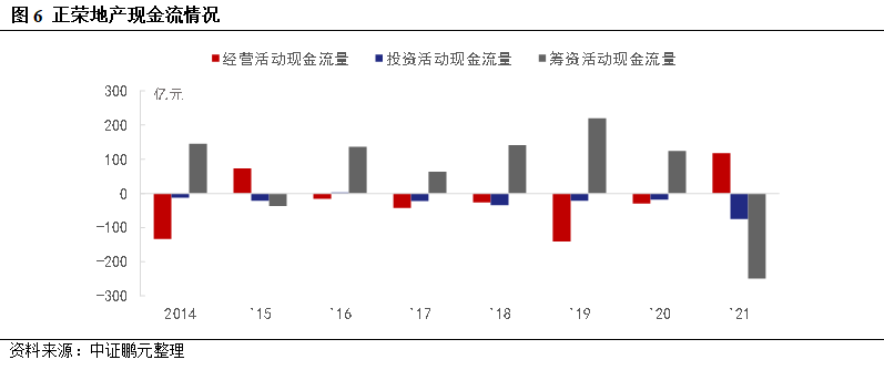 借助債務融資,正榮地產(chǎn)2016年來迅速擴張,2018年赴港上市成功,同年步入銷售額千億房企。2019年,惠譽將公司級別由B上調(diào)至B+,穆迪由B2上調(diào)至B1,2021年6月惠譽繼續(xù)上調(diào)展望至正面。正榮地產(chǎn)的債券融資以境外市場為主,境內(nèi)市場以資產(chǎn)支持證券為主要品種,發(fā)行日集中在2020年,到期日集中在2021年和2023年。高度依賴外部融資的“高杠桿、高周轉(zhuǎn)”模式,在2021年下半年被迫結(jié)束。2021年,正榮地產(chǎn)籌資活動現(xiàn)金流由正大幅轉(zhuǎn)負,境內(nèi)債券融資腰斬,境外債券融資抓住上半年窗口期,此后融資也開始減少。隨著債務陸續(xù)到期,2021-2023年償還壓力大幅攀升,外部融資高度敏感,2021年公司加大回購債券力度,分多次累計回購約0.65億美元債券,提振市場信心。2022年伊始,三大評級機構(gòu)相繼下調(diào)公司發(fā)行人級別。