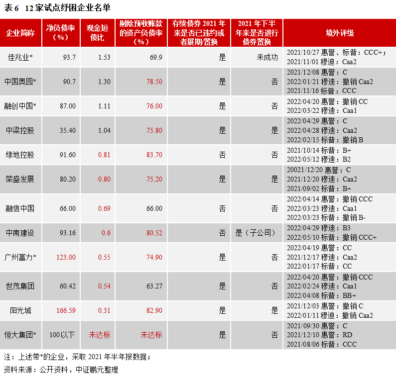 從目前企業(yè)所處困境和政策支持來看,12家重點紓困企業(yè)是進行債券置換和同意征求的合適對象。一方面,是企業(yè)有金融機構(gòu)的資金支持,可以較快緩解短期流動性壓力,另一方面,上述企業(yè)2021年合約銷售額均在1,000億元以上,集中在全國前三十,業(yè)務以長三角為主,土儲質(zhì)量較高,未來項目去化環(huán)境較好。一定程度的外部支持,可以極大推動企業(yè)債務風險化解,降低交換風險。截至2022年5月14日,12家房企中6家未公布2021年年報,其中,融信中國和廣州富力因更換會計師而延期披露。根據(jù)各家公司最新數(shù)據(jù)(上述6家采用2021年半年報),其中陽光城和廣州富力為紅擋。目前,除綠地控股、融信中國和中南建設外,其余企業(yè)在2021年來均出現(xiàn)了美元債違約、展期或置換。具體來看,除凈負債率外,另外兩個指標多未達標,尤其是現(xiàn)金短債比。短債上升、現(xiàn)金減少,使得該指標惡化。即使現(xiàn)金短債比達標,但集團內(nèi)部或存在資金使用不規(guī)范的問題,限制比例升高,都會造成償債資金缺口。
