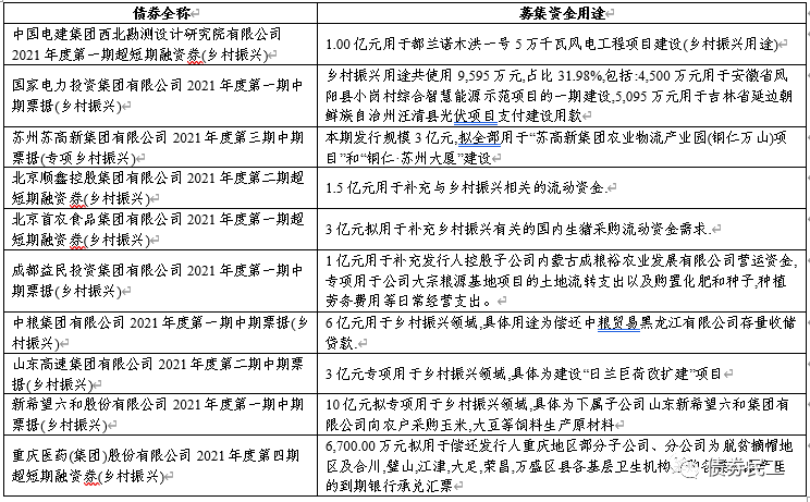 自2021年3月16日,重慶醫(yī)藥(集團(tuán))股份有限公司2021年度第四期超短期融資券(鄉(xiāng)村振興)作為第一只鄉(xiāng)村振興票據(jù)面世以來(lái),鄉(xiāng)村振興票據(jù)受到的關(guān)注越來(lái)越多。2021年3月19日,銀行間市場(chǎng)交易商協(xié)會(huì)通過(guò)官方微信公眾號(hào)發(fā)布了《債務(wù)融資工具注冊(cè)發(fā)行業(yè)務(wù)問(wèn)答(第8期)》(以下簡(jiǎn)稱“《問(wèn)答》”),對(duì)鄉(xiāng)村振興票據(jù)的實(shí)施細(xì)則進(jìn)行了明確,確認(rèn)募集資金投向分別對(duì)應(yīng)的是農(nóng)民就業(yè)增收項(xiàng)目、農(nóng)業(yè)現(xiàn)代化建設(shè)項(xiàng)目和農(nóng)村鄉(xiāng)村建設(shè)三大領(lǐng)域。