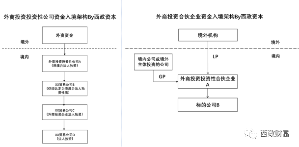 目前通過FDI方式進行入境架構搭建除了設立一般的貿易項下的貿易類公司(資金用途層層核查)外,亦可通過設立外商投資投資性公司或外商投資投資性合伙企業的方式進行操作。但是,其中設立外商投資投資性公司方式資金入境,對于外資資金有相關準入要求,如有的區域要求申請前一年該投資者的資產總額不低于2億美元或要求不低于4億美元;且該投資者在中國境內已投資1000萬美元(按照實繳資本來看)等等。其基本架構如下: