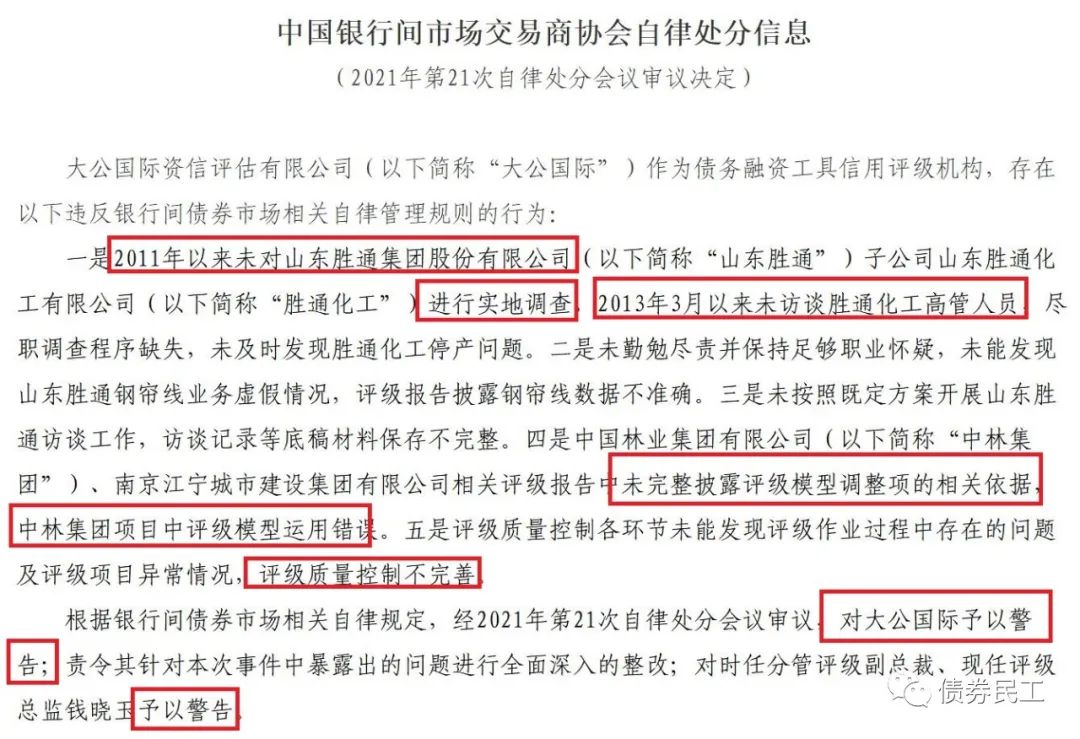 根據(jù)中國銀行間市場交易商協(xié)會2021年12月16日的公告信息,大公國際資信評估有限公司因?yàn)閭€(gè)別項(xiàng)目中存在盡職調(diào)查程序缺失、未勤勉盡責(zé)、未披露評級模型調(diào)整項(xiàng)的依據(jù)以及評級質(zhì)量控制不完善等問題,被予以警告。